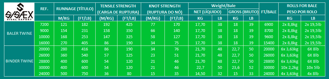 Fio de sisal com pouca variação de espessura e fabricado com excelente controle de tensão de ruptura podendo operar em diversas máquinas enfardadeiras.